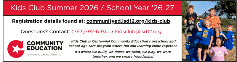 Kids Club is a certified, fee-based childcare program provided by ISD #12 - Centennial Community Education.